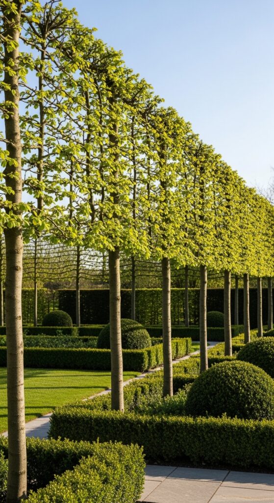 How to achieve it: Hornbeam (Carpinus betulus) and lime (Tilia cordata) are the classic pleaching species — both train easily and maintain structure. Purchase pre-started pleached trees on 1.8m clear stems for immediate impact, though at higher cost. Annual pruning in late winter maintains the flat canopy form and keeps the structure dense.