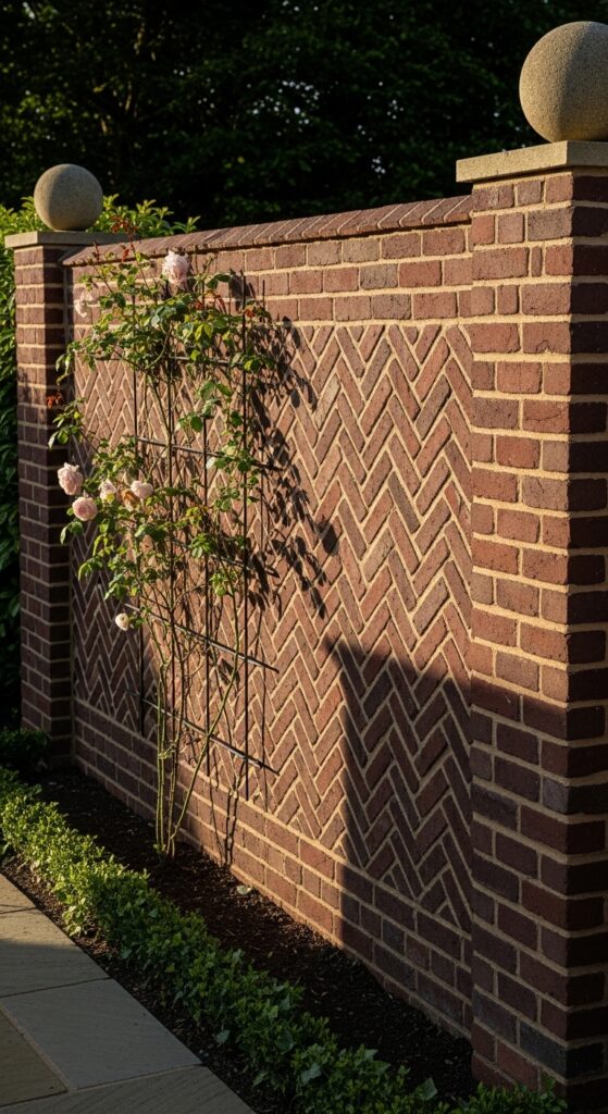 What makes it work: Herringbone brickwork transforms a standard brick wall into a genuine craft object — the diagonal pattern creates dynamic visual energy that standard stretcher-bond brickwork simply doesn’t have. The pattern also requires no special bricks or tools, just a skilled layer willing to cut each brick to the diagonal return at the wall edges.