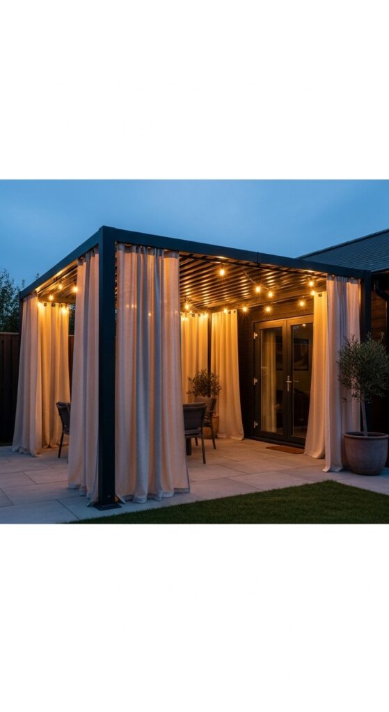What makes it work: Outdoor curtain panels on a pergola frame solve the privacy challenge flexibly — pull them closed for a private evening, open them wide for a breezy afternoon. The soft, drapery quality of outdoor linen curtains also introduces a domestic warmth into the garden that structural screens or fences never achieve. The full-length floor-to-ceiling drop is essential — curtains that fall short look unfinished and feel less private.
