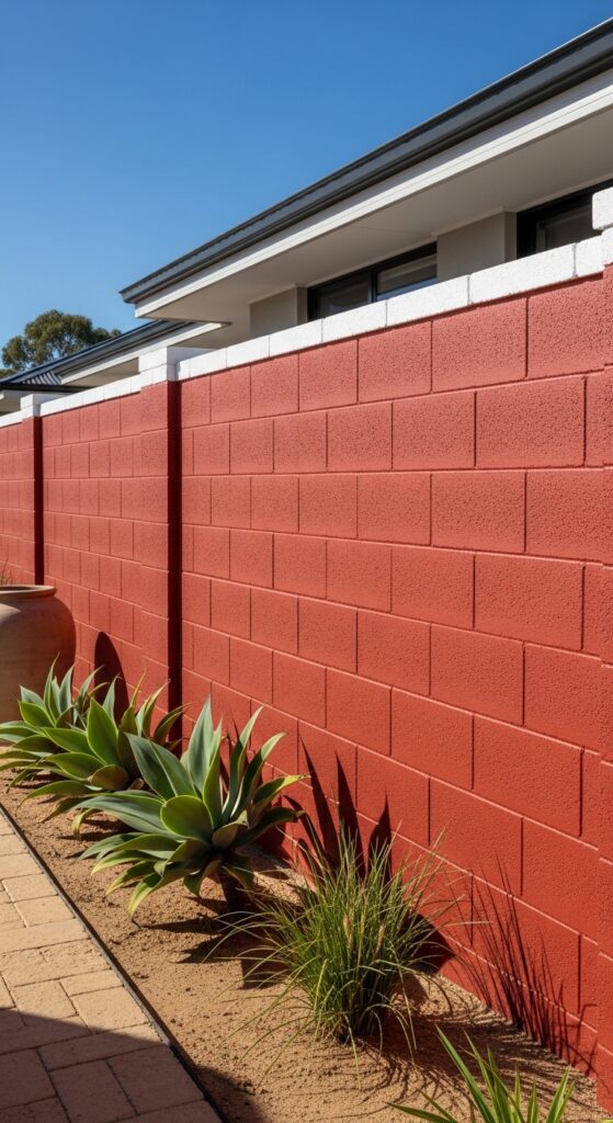 How to achieve it: Decorative concrete screen blocks are available from specialized concrete suppliers and some landscape yards, typically costing $8–20 per block. Lay in standard masonry bond pattern using regular mortar, with reinforcing rods through every third vertical row for structural integrity. Paint with exterior masonry paint in a single strong color — brilliant white, terracotta, or charcoal all produce striking results.
