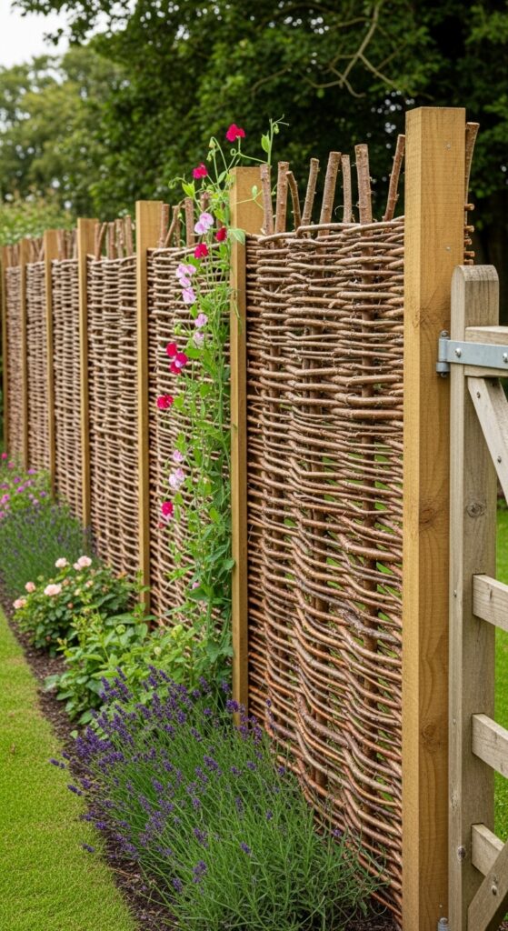 What makes it work: Woven hurdle panels bring a handcraft quality to garden privacy that no manufactured fence or screen achieves — each panel is unique, slightly irregular, and visually rich with the texture of woven branches. The natural material weathers to a beautiful silver-grey over time, relating naturally to bark, stone, and other organic garden materials.
