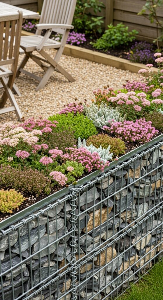 What makes it work: Topping a gabion wall with a planted trough or a layer of growing medium transforms a purely structural element into an ecological one — sedum, thyme, and alpine plants colonize the top surface, attracting pollinators and softening the industrial cage structure dramatically. The combination of industrial material below and delicate plant life above creates a sophisticated material contrast.