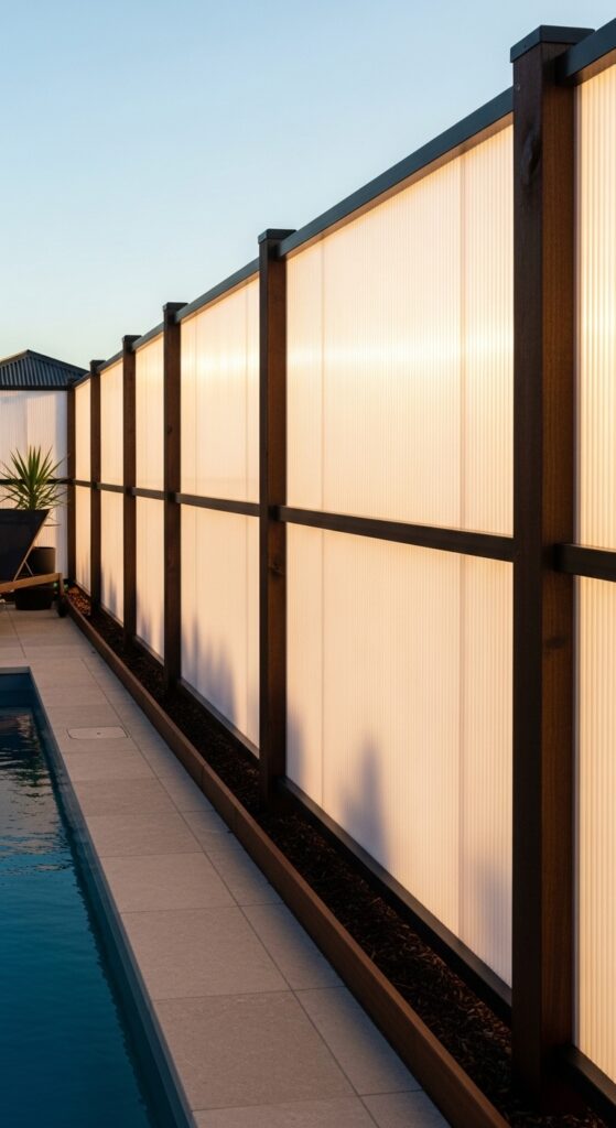 What makes it work: Translucent polycarbonate panels create privacy through light diffusion rather than solid opacity — they obscure clear views while allowing a warm, diffused glow of light to pass through, keeping the space bright on both sides. At night, when interior or pool lighting is on, the panels glow from within, creating a striking lantern effect.