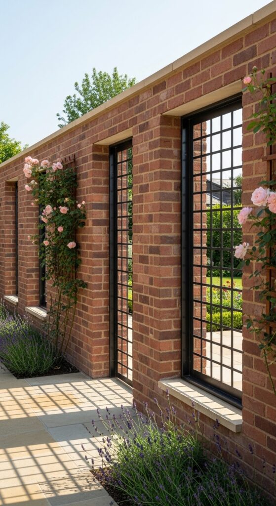 What makes it work: Combining masonry piers with metal infill panels creates a structural and aesthetic hybrid that is richer than either material alone. The brick piers anchor the wall to the building’s traditional architecture, while the steel grid infill introduces contemporary precision and openness — together they achieve a privacy wall that reads as genuinely considered rather than off-the-shelf.
