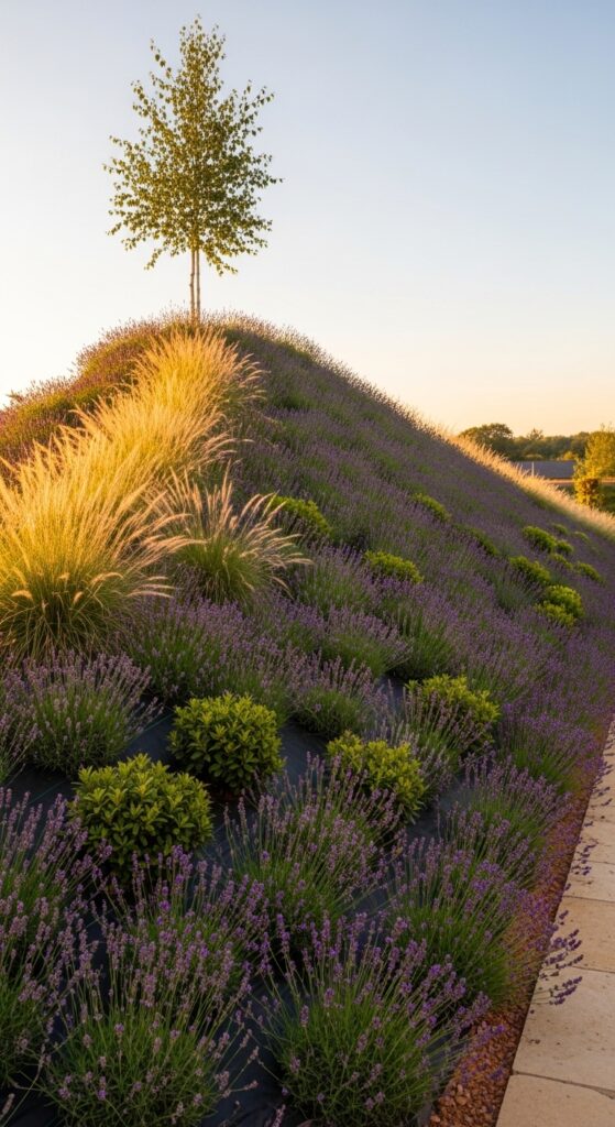 How to achieve it: Shape the berm in a gradual mound no steeper than 1:3 slope ratio to prevent erosion. Layer geotextile over the shaped earth before planting to suppress weeds. Plant at 150–200% of standard density for immediate coverage, using a backbone of evergreen structural shrubs (box, holly, pittosporum) with ornamental grasses and perennials filling in between.