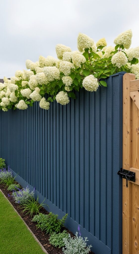 What makes it work: Deep slate blue is one of the most flattering backdrop colors for garden planting — it makes foliage appear more vivid and flowers more luminous by contrast, functioning like a jeweler’s black velvet pad for the climbing plant display above. Climbing hydrangea is the perfect companion because it is genuinely self-clinging, needing no wires or support once established.