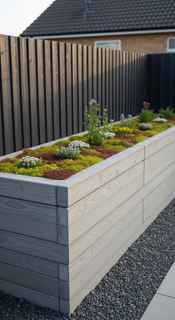 What makes it work: A green roof capping on a garden wall represents the ultimate integration of structure and landscape — the wall provides privacy and architectural definition, while the planted top brings ecological value, visual softness, and a genuine point of design difference. Board-formed concrete for the wall body reinforces the contemporary architectural language while providing a long-lasting, zero-maintenance substrate.