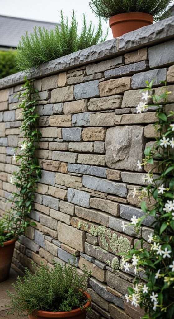 What makes it work: Natural stone walls carry a visual weight and permanence that no manufactured material can replicate. The irregular coursing creates unpredictable shadow patterns that shift throughout the day, making the wall visually dynamic without any additional decoration. Stone also improves aesthetically over time, as lichen, moss, and climbing plants colonize the surface naturally.