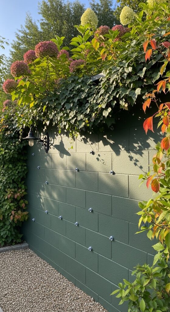 What makes it work: A rendered and painted concrete block wall gives climbing plants a clean, high-contrast backdrop that makes foliage color and texture pop dramatically. The painted surface also gives you design flexibility that raw concrete block lacks — you can shift the palette simply by repainting, while the plants mature independently.
