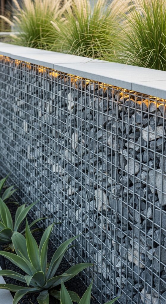 What makes it work: Gabion walls achieve something visually unique — the texture and warmth of natural stone with the geometric precision of engineered construction. The visible wire mesh grid creates a strong geometric pattern that reads as intentionally modern rather than utilitarian, especially when filled with carefully selected stone in a cohesive color range.