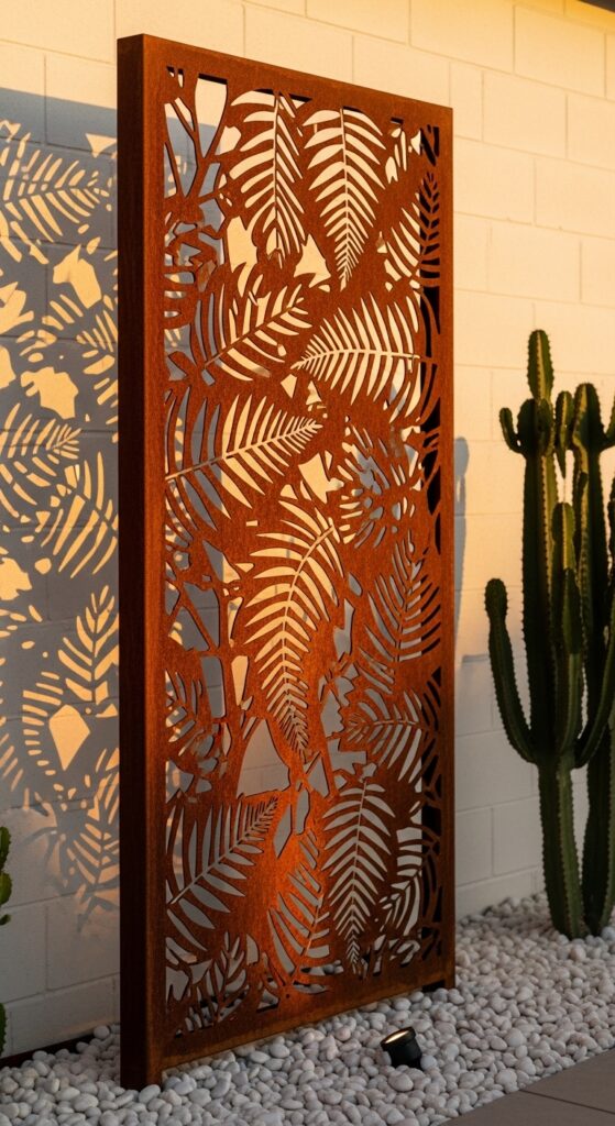 What makes it work: Corten steel’s self-oxidizing rust patina is one of the most distinctive and low-maintenance exterior finishes available, developing a rich, multi-toned amber-rust surface that never looks the same twice. Laser-cut patterns transform a privacy panel into a sculptural feature — the shadow patterns cast by sunlight through the cut design create a living, shifting artwork across adjacent walls and ground surfaces.