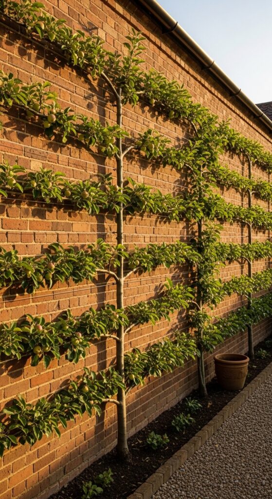 What makes it work: Espalier training flattens a tree’s growth into a two-dimensional form against a wall, creating a living screen that provides privacy, seasonal beauty, fruit production, and habitat for birds — all in a single structural element. The geometric precision of the training wires gives the wall a tailored, architectural quality that purely ornamental climbing plants lack.