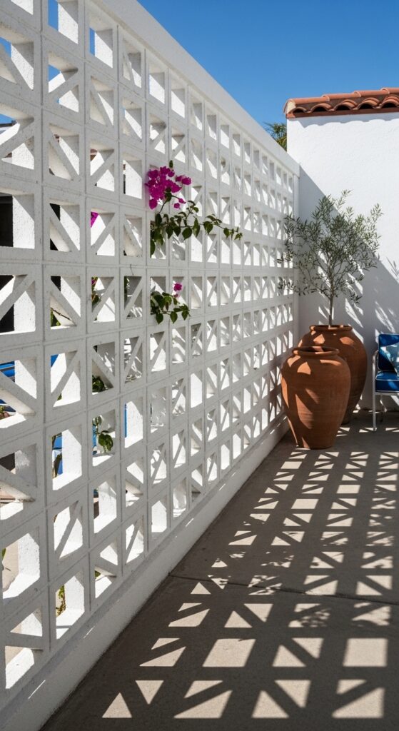 What makes it work: Decorative breeze blocks create privacy while simultaneously functioning as sun-control screens, with their geometric openings casting extraordinary geometric shadow patterns that shift as the sun moves throughout the day. This makes the wall visually engaging at every hour — the shadow patterns are as much a design element as the blocks themselves.