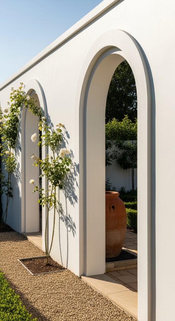 What makes it work: Arched openings in a solid privacy wall solve the psychological problem of enclosed spaces feeling too closed-off or claustrophobic. By framing deliberate views through carefully placed openings, the wall creates a sense of mystery and depth — you can see through, but not into, the private space beyond. The arch form itself is one of architecture’s most universally beautiful shapes.