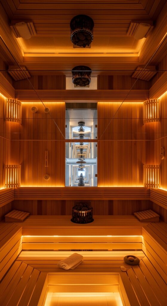 Vibe sentence: A mirrored ceiling in a sauna dissolves the boundary between the room and its reflection, creating a space that feels genuinely boundless — the most unexpected luxury.