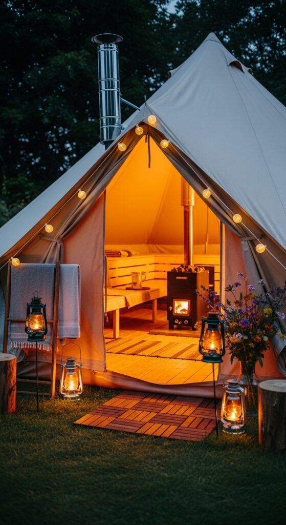What makes it work: Canvas naturally regulates humidity — the breathable fabric allows moisture to escape while retaining heat, creating a naturally balanced sauna environment without mechanical ventilation. The warm glow of a lit canvas tent from outside is one of the most visually beautiful effects in any garden setting, and the temporary, gathering-oriented nature of a tent sauna makes it inherently social in a way that a permanent structure often is not.