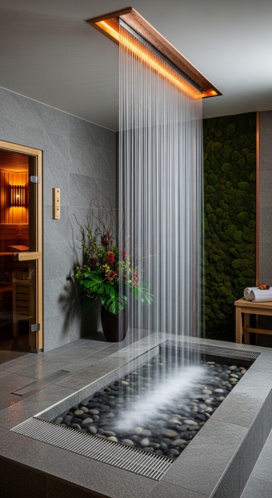 Vibe sentence: A cold waterfall sheet you walk through on the way from the sauna is the single most dramatically satisfying wellness moment a home can contain.