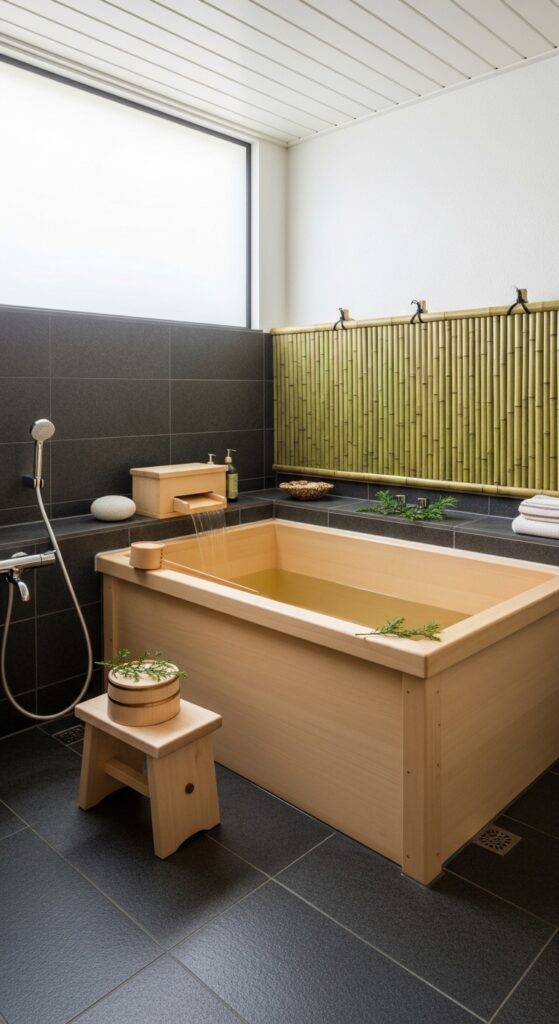 What makes it work: The Japanese ofuro (deep soaking tub, traditionally in hinoki cypress) used in conjunction with a sauna creates a complete bathing ritual that addresses the body’s needs more comprehensively than either practice alone. The sequence — rinse, sauna, cold plunge or cool shower, ofuro soak — follows the traditional Japanese sento protocol and produces a level of physical and psychological restoration that Western bathing culture rarely achieves. The hinoki wood of the tub releases the same citrus-cedar aromatics as the sauna interior, creating olfactory continuity across the entire ritual.