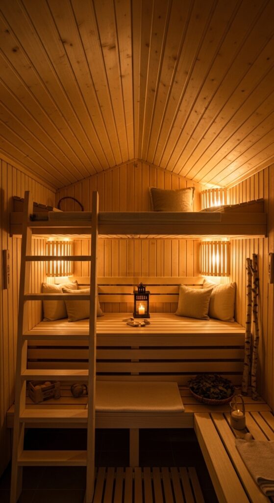 How to achieve it: A double-height sauna requires a minimum ceiling height of approximately 8.5–9 feet to accommodate both the standard bench level (at 24 inches) and a usable loft space (at 66–72 inches) with comfortable access via a ladder. The loft platform is framed from the same timber as the bench system and lined with the same tongue-and-groove paneling as the walls. Ensure the upper level has appropriate ventilation as overheating is a genuine safety consideration at the apex of a high sauna.