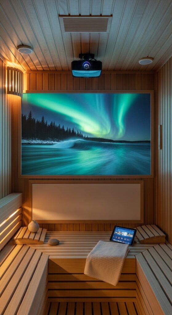 How to achieve it: Use a heat-rated short-throw projector mounted in a recessed, ventilated ceiling housing with a heat-stable lens cover. Project onto a matte white panel flush-mounted within the cedar wall paneling — the panel material must be rated for the sauna temperature range. Connect to a tablet or media player in the mechanical room outside the sauna for content management. Maintain the remaining walls in natural cedar to preserve the warmth and authenticity of the material environment.