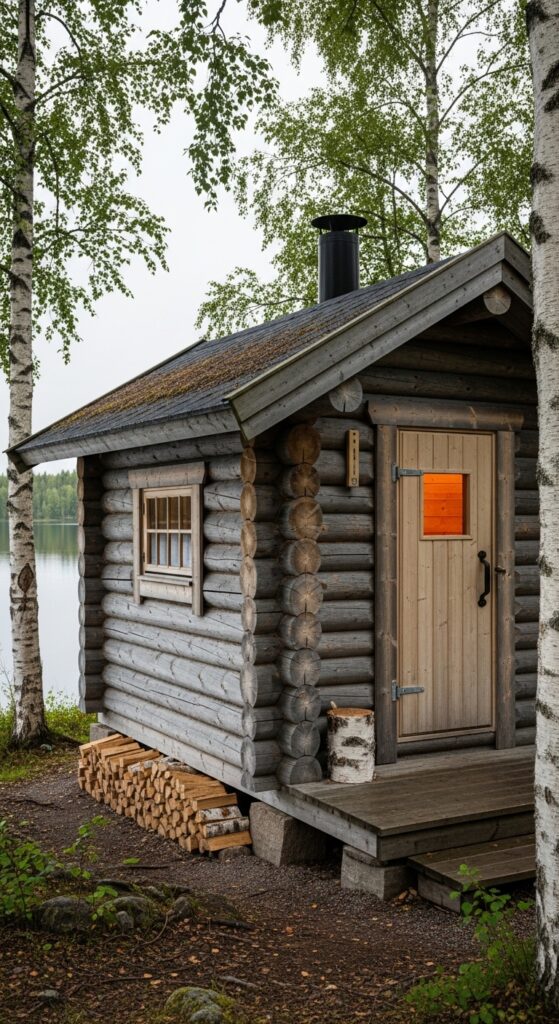 Vibe sentence: A hand-hewn log sauna beside a Finnish lake is not a building — it is the physical expression of a culture’s most essential understanding of what it means to be at home in the world.