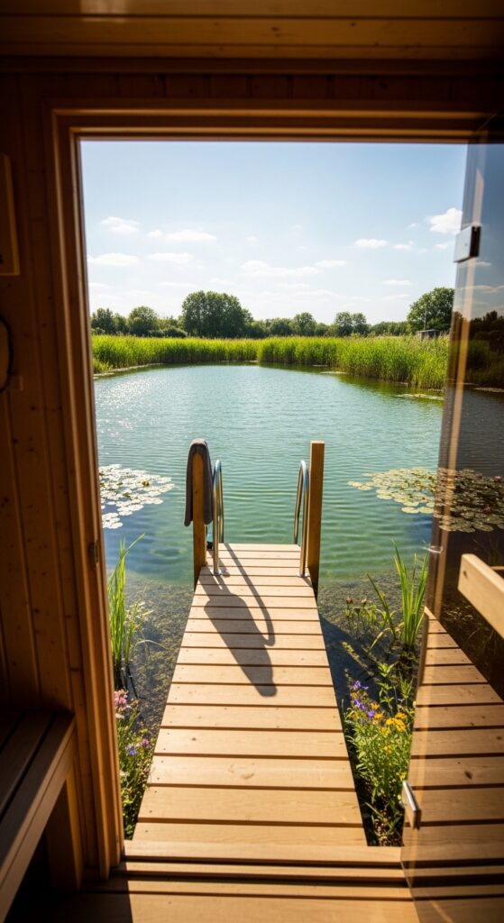 How to achieve it: Natural swimming pond design is a specialist discipline — companies including Biotop Natural Pool and Clear Water Revival design and install ecologically filtered swimming ponds ranging from compact 4×6 meter designs to large landscape features. A minimum volume of approximately 50 cubic meters is required for stable ecological filtration. The sauna is positioned at the pond edge with a dock extending 1–2 meters over the water to provide direct entry access.