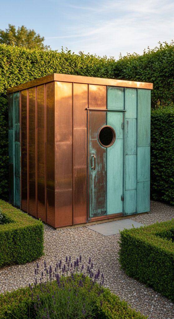 What makes it work: Copper cladding on an outdoor structure is one of the most extraordinary long-term design investments possible — new copper begins as a bright amber-gold, gradually developing through brown and chocolate tones before eventually settling into the characteristic blue-green verdigris that has been the defining aesthetic of copper architecture for centuries. The material literally improves with time and weather, making a copper-clad sauna cabin a garden feature that becomes more beautiful the older it gets.