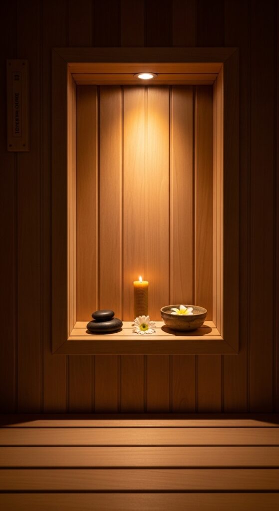 How to achieve it: Build a recessed alcove into the sauna wall opposite the bench — approximately 24 inches wide, 12 inches tall, and 8 inches deep — at seated eye level (approximately 48 inches from the floor). Line the alcove interior in the same cedar paneling as the wall, or use a contrasting material such as slate or smooth plaster for visual distinction. Install a single warm LED spotlight recessed in the alcove ceiling to illuminate the space gently.