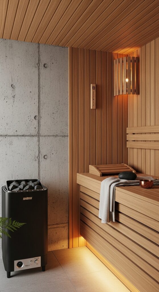 How to achieve it: Use board-formed concrete panels (pre-cast concrete panels with formwork texture) as a cladding system applied over standard wall framing — this avoids the structural complexity of poured-in-place concrete while achieving the identical visual result. Ensure the concrete surface is sealed with a heat-stable penetrating sealer before installation. Pair with vertical cedar paneling on the opposing walls and a matte black kiuas for complete palette cohesion.