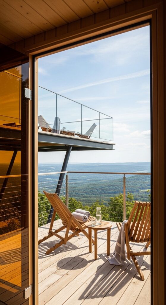 Vibe sentence: Stepping from a hot sauna onto a cantilevered terrace above a valley or forest is the single most physically exhilarating transition in any wellness design.