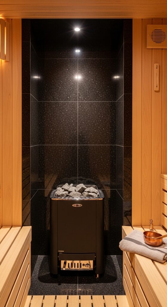 Vibe sentence: A polished black granite kiuas surround makes the stove look like an altar — and in a sauna, that is exactly what it is.