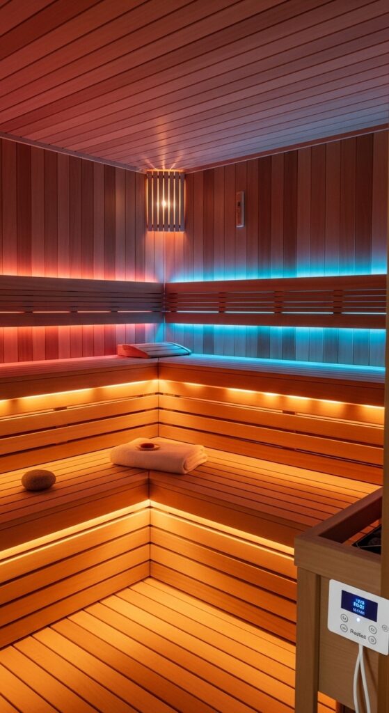 Vibe sentence: Chromotherapy in a sauna transforms the session from a single-sense experience into a full-spectrum sensory environment — warmth you feel, warmth you see.