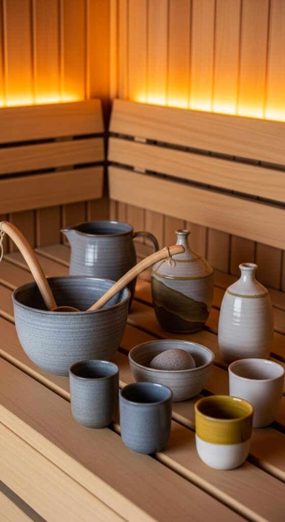What makes it work: Hand-thrown ceramics introduce a quality of individual craft attention into the sauna space that speaks directly to the intention behind the wellness ritual — both the ceramic maker and the sauna practitioner are engaged in acts of deliberate, slow, skilled attention to material and form. The slight imperfection of hand-thrown work — the throwing lines, the glaze variations, the asymmetries — creates objects that reward close attention and reward the slowed perception that sauna sessions cultivate.