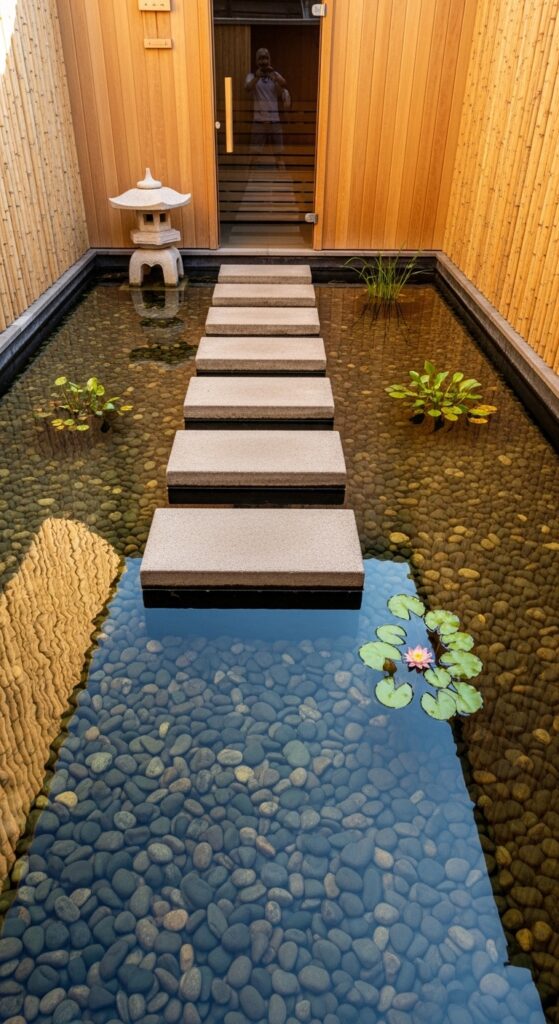 How to achieve it: A shallow water feature moat (300mm deep, lined with a butyl rubber pond liner) surrounds the sauna structure on the accessible sides. The stepping stones are simple, heavy concrete or natural stone pads placed at comfortable stride intervals (approximately 18–24 inches center to center). Maintain the water with a small submersible filter pump and introduce one or two aquatic plants for ecological balance and visual beauty.