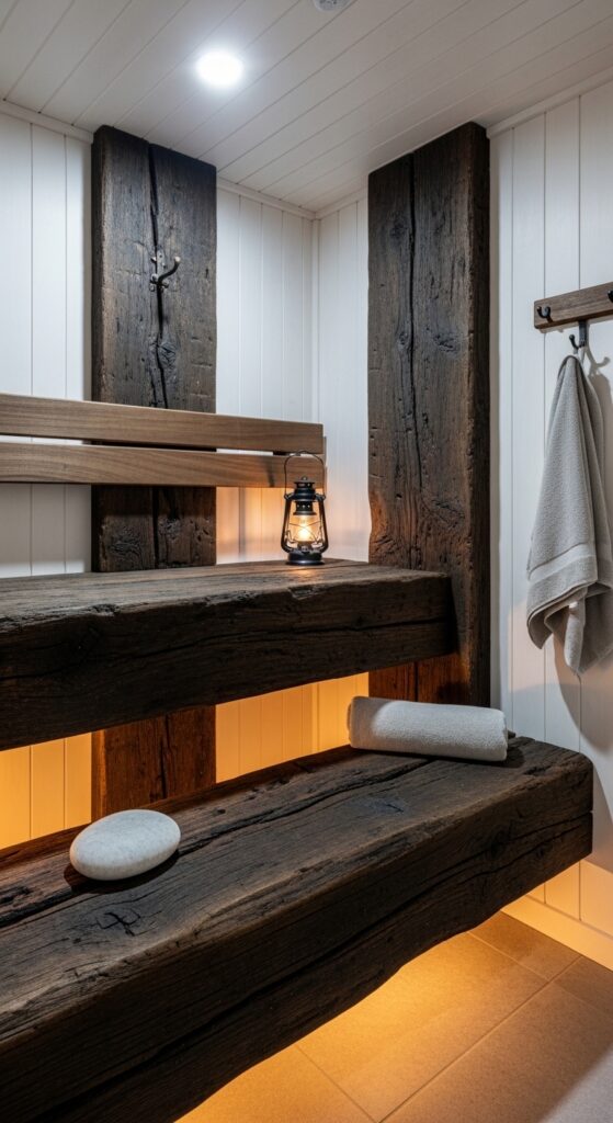 What makes it work: Reclaimed oak railway sleepers are among the densest and most thermally stable wood products available — the combination of old-growth oak’s natural density with decades of creosote impregnation (most of which has fully cured in old sleepers) creates a material of extraordinary hardness and thermal mass. As sauna bench surfaces, the sleeper’s mass retains heat differently from conventional bench timber, providing a radiant warmth from the bench surface that conventional sauna boards cannot match.