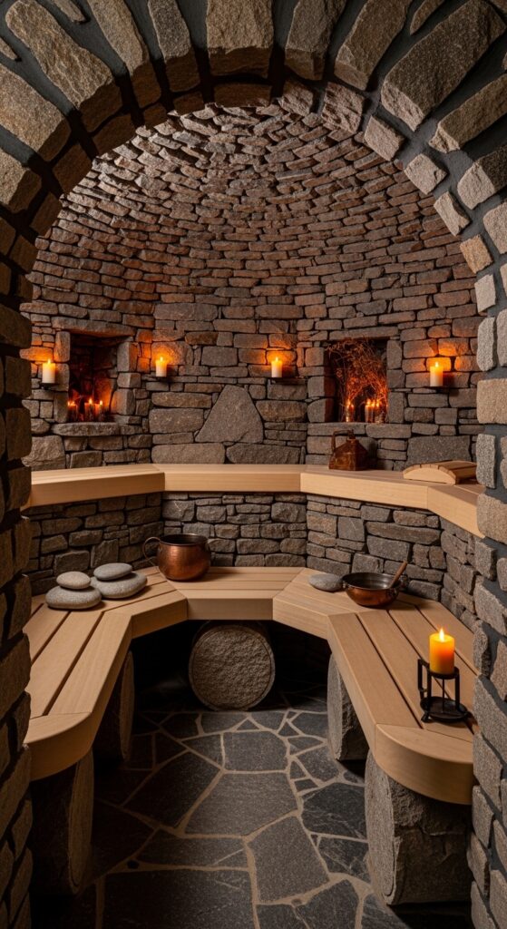 What makes it work: Natural stone has one of the highest thermal masses of any building material — once heated, it stores and radiates warmth for hours after the heat source has been reduced. A stone-walled sauna therefore develops a deeply enveloping, radiant warmth that feels qualitatively different from a wood-paneled interior — softer, more surrounding, more ancient. The irregular surfaces of natural fieldstone also create extraordinary acoustic absorption, making stone saunas remarkably quiet and still.