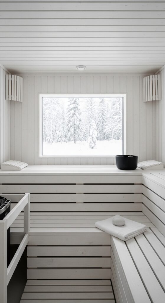 What makes it work: White-painted sauna interiors are a distinctly contemporary Scandinavian design choice — the paint does not affect the wood’s ability to breathe or regulate humidity when a heat-stable, water-based mineral paint is used, while the white surface reflects light back into the sauna, creating a brighter, more expansive interior that reads as luxurious in a different register from the warmth of natural wood. Against a winter snow landscape visible through a large window, the effect is extraordinary.