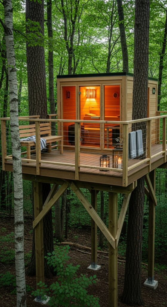 Vibe sentence: A treehouse sauna at canopy level makes every session feel like the beginning of a fairytale — warm, suspended, entirely removed from the ground and everything on it.