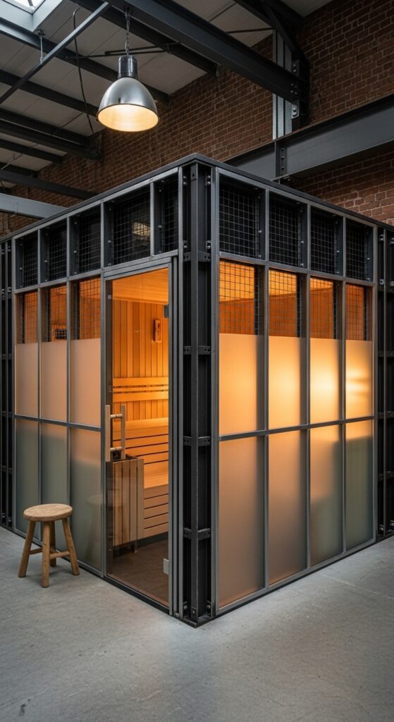 Vibe sentence: A steel-framed glass sauna enclosure in an industrial loft is the most architecturally honest thing you can build in a converted warehouse — it makes no apology for what it is.