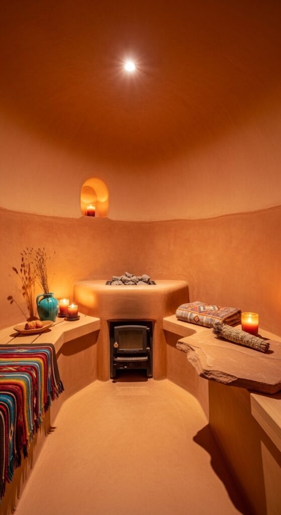What makes it work: Earthen plaster (adobe or cob) is one of the oldest and most thermally intelligent building materials in existence — it has exceptional thermal mass, regulates humidity naturally, and creates the dry heat environment that is both the traditional and physiologically optimal condition for a desert-style sauna. The smooth, hand-troweled surface of earthen plaster develops a subtle color variation across its area that is impossible to replicate with any manufactured finish.