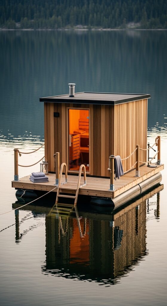 Vibe sentence: A floating sauna on still water makes the cold plunge not merely possible but inevitable and magnificent — you simply open the door, walk three steps, and enter the lake.