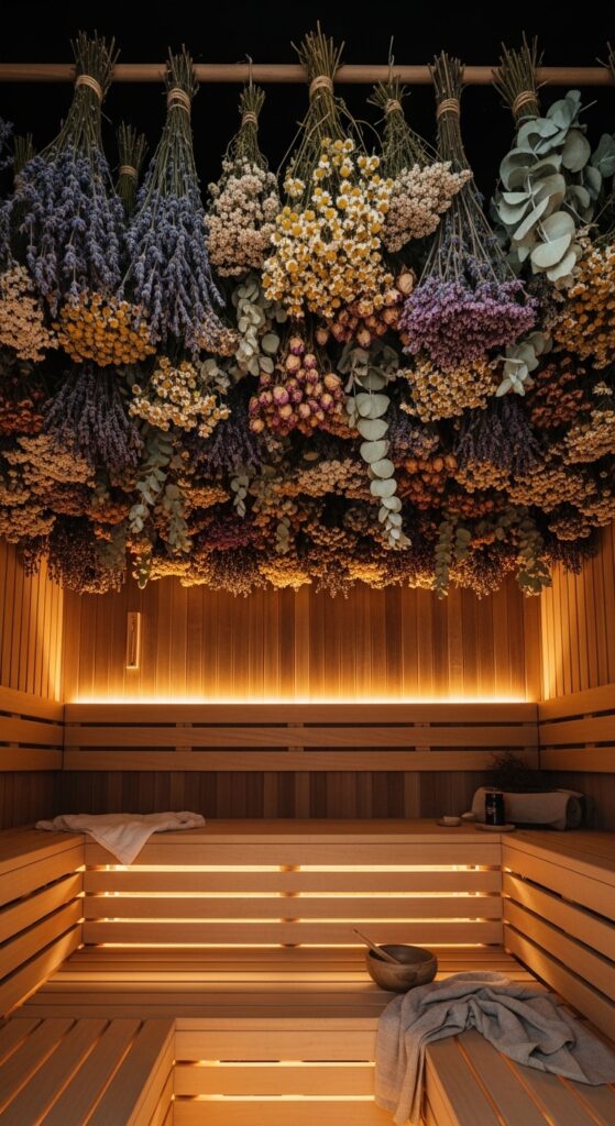 Vibe sentence: A ceiling of suspended dried botanicals in a sauna turns aromatherapy from an accessory into an architecture — you are quite literally bathing inside the herbs.