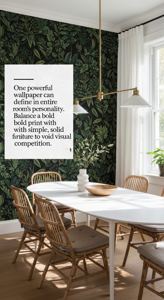 Text: One powerful wallpaper pattern can define an entire room’s personality. Balance a bold print with simple, solid furniture to avoid visual competition.