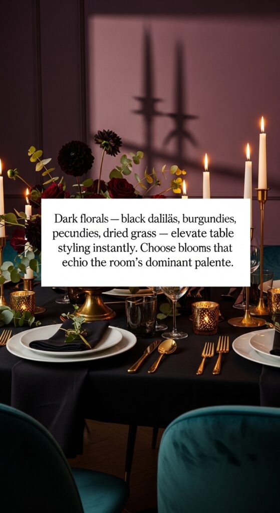 Text: Dark florals — black dahlias, burgundy peonies, dried grasses — elevate table styling instantly. Choose blooms that echo the room’s dominant palette.