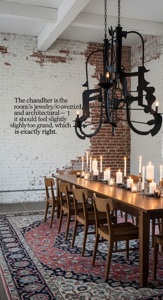 Text: The chandelier is the room’s jewelry. Go oversized and architectural — it should feel slightly too grand, which is exactly right.
