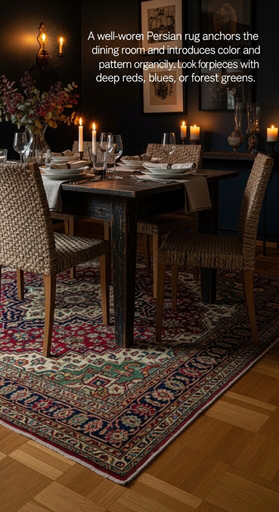 Text: A well-worn Persian rug anchors the dining room and introduces color and pattern organically. Look for pieces with deep reds, blues, or forest greens.