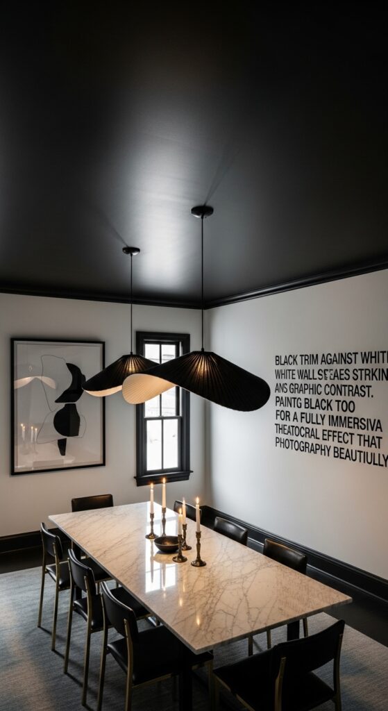 Text: Black trim against white walls creates a striking graphic contrast. Paint ceiling black too for a fully immersive, theatrical effect that photographs beautifully.