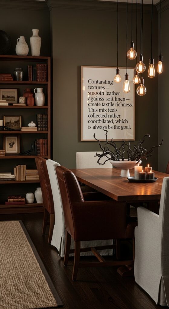 Text: Contrasting textures — smooth leather against soft linen — create tactile richness. This mix feels collected rather than coordinated, which is always the goal.