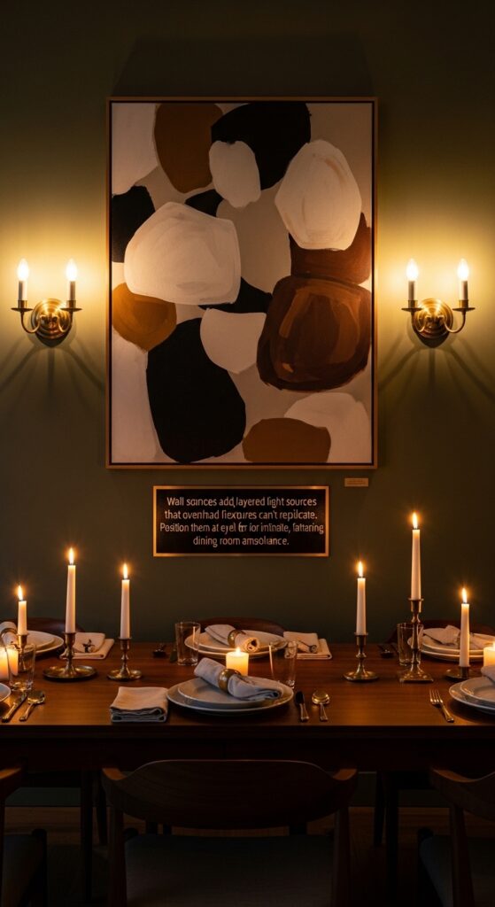 Text: Wall sconces add layered light sources that overhead fixtures can’t replicate. Position them at eye level for intimate, flattering dining room ambiance.