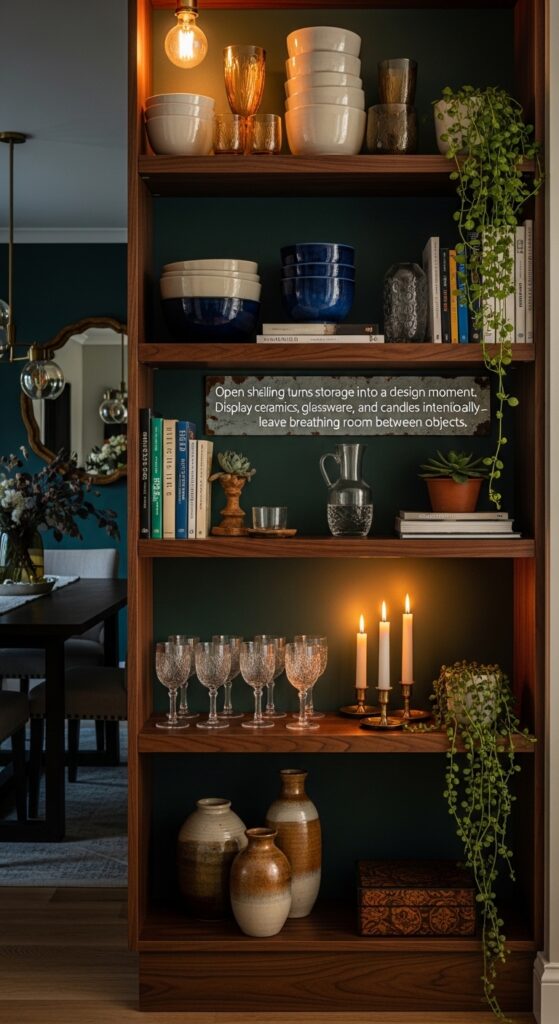 Text: Open shelving turns storage into a design moment. Display ceramics, glassware, and candles intentionally — leave breathing room between objects.